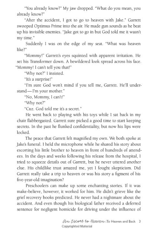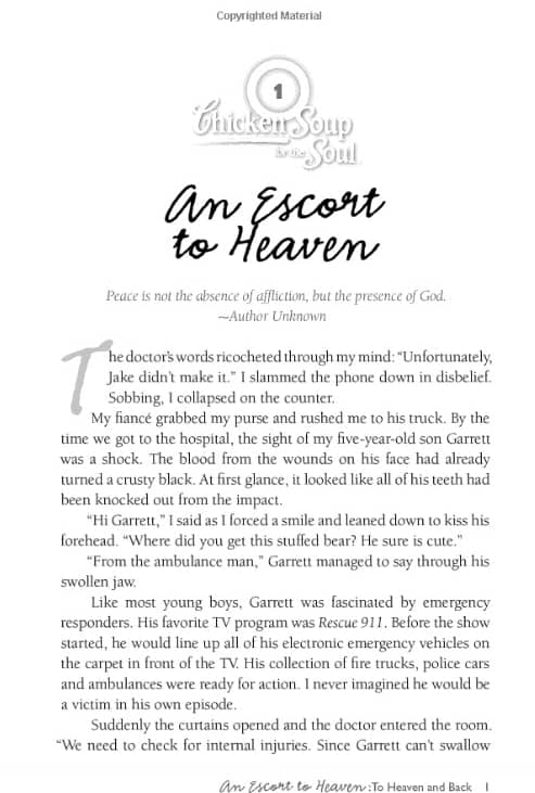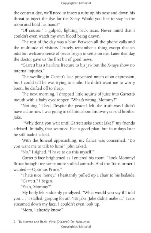 Garrett spent five days in Children’s Hospital recuperating from his injuries. I fed him juices with a baby eyedropper because his jaw was so swollen he couldn’t get his lips around a straw. The night before he was released he told me an amazing story about his trip to heaven. Chicken Soup for the Soul published his story, An Escort to Heaven, in their Messages from Heaven series in 2012.